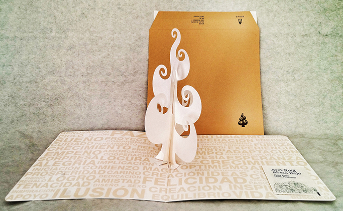 Para esta campaña se diseñó y construyó un árbol de tres piezas móviles que le permitiesen plegarse y desplegarse al cerrar y abrir la tarjeta. El interior de la tarjeta es un sustrato de los mejores deseos para abonar ese árbol, ese sueño.